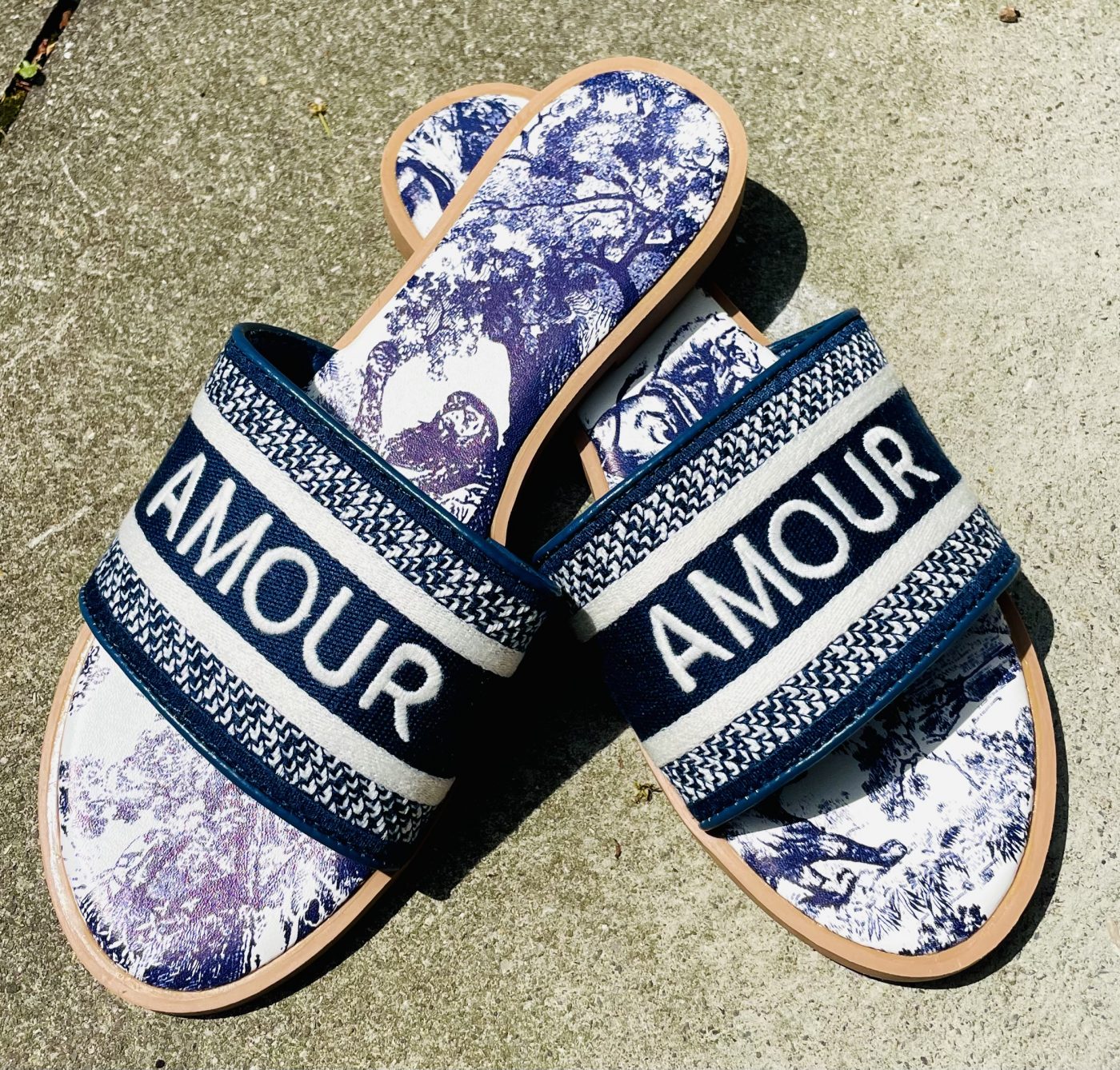Wunderschöne blaue Sandale mit einem einzigartigen Print. Der Schlappen erinnert