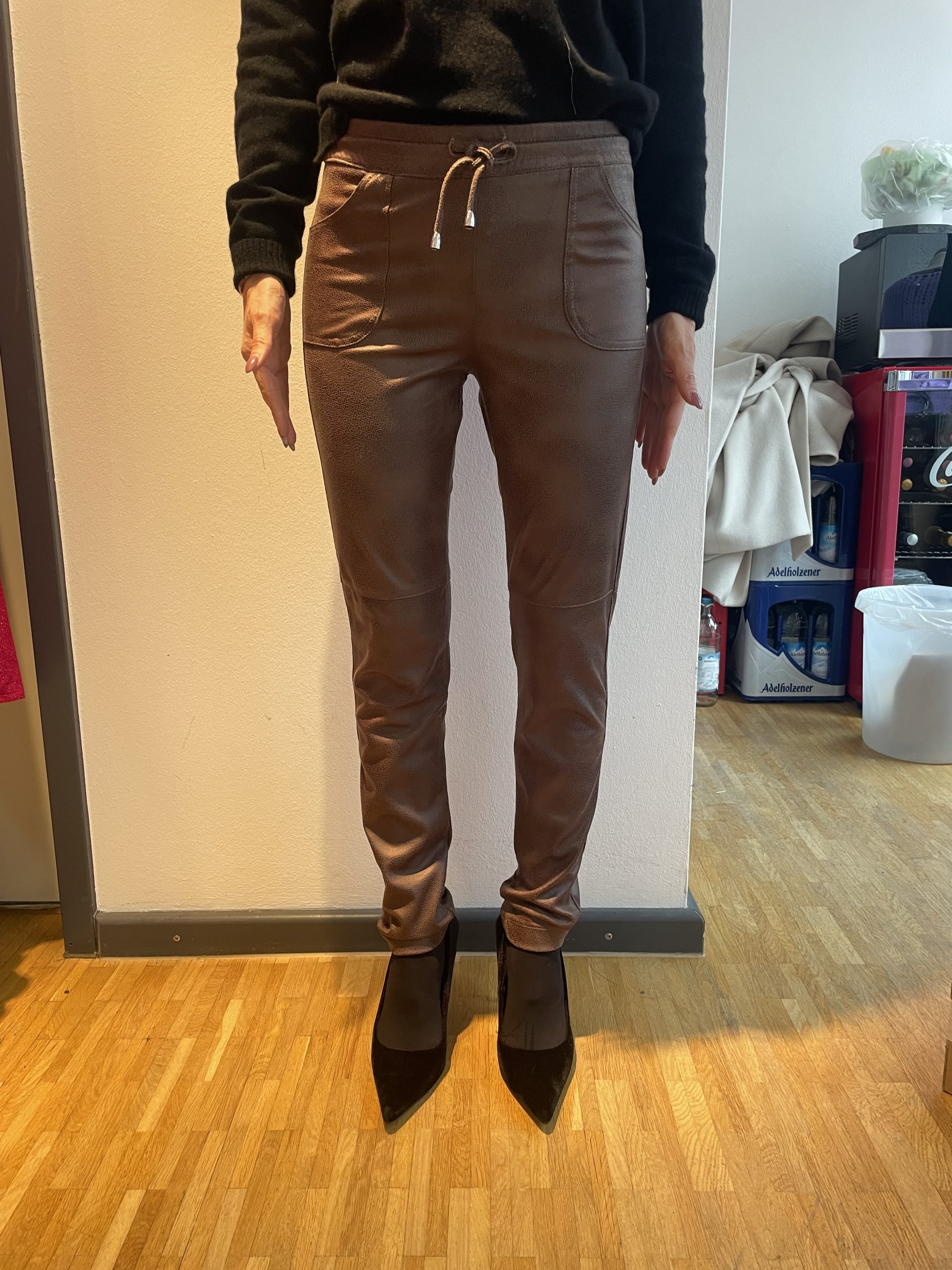 Unsere Joggpants haben einen elastischen Taillienbund und einen Tunnelzug und sind genau wie unsere Leggings zum Beispiel gut kombinierbar mit einem längeren Pullover oder einer Longbluse. Die Joggpants haben im Vergleich zu den Leggings vorne noch Taschen und sind am Oberschenkel etwas weiter geschnitten als die Leggings.