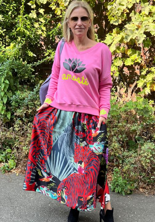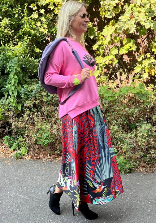 Maxi-Rock aus zartem Viskose-Satin mit farbenfrohem, grafischen Muster. Der elastischer Formbund sorgt für einen guten Sitz, der Rock hat zwei Eingrifftaschen.