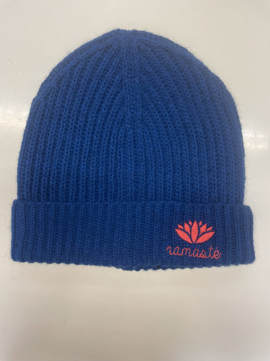 Trendige Mütze im Rippstrick mit breitem Rand und kleiner Stickerei.