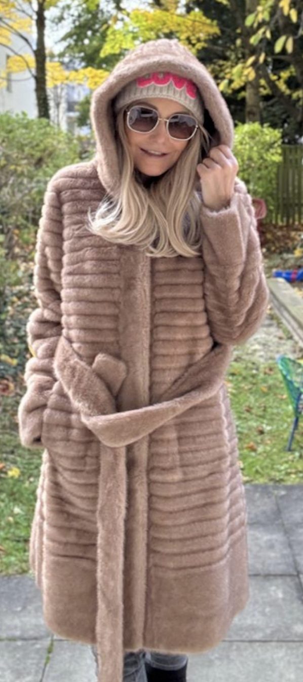 Unser wunderschöner Kunzpelzmantel der Marke Sandro Ferrone hat eine Midi Länge.