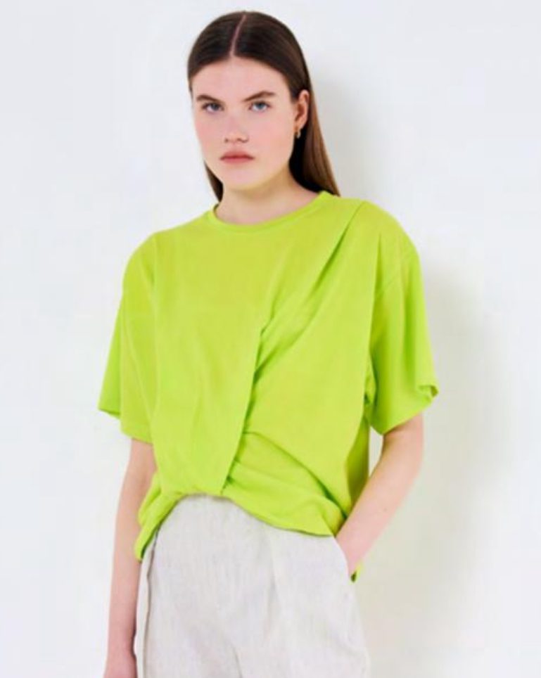 Saftes T-Shirt in neongrün mit einem runden Ausschnitt und unten ist das Shirt zu einem lässig gebunden.